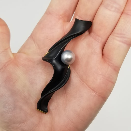 Black Chalcedony Sculpture with Pearl in 18kt Pendant & Brooch