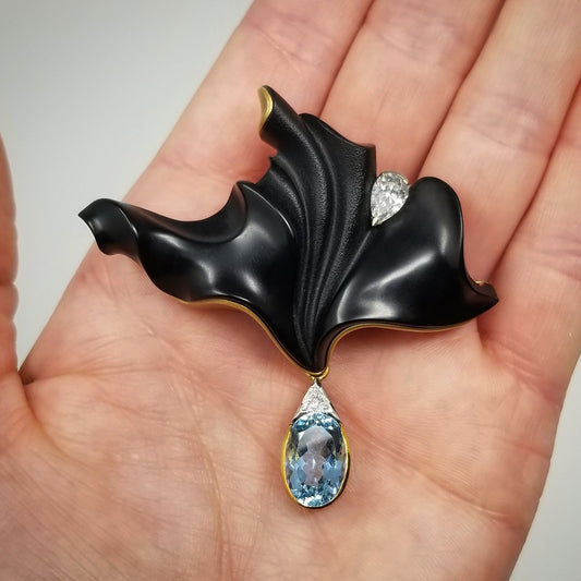 Black Chalcedony Sculpture with Aquamarine in 18kt Pendant, Enhancer, & Brooch