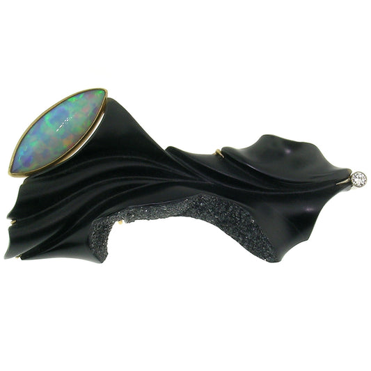 Black Chalcedony Sculpture with Opal in 18kt Pendant, Enhancer, & Brooch