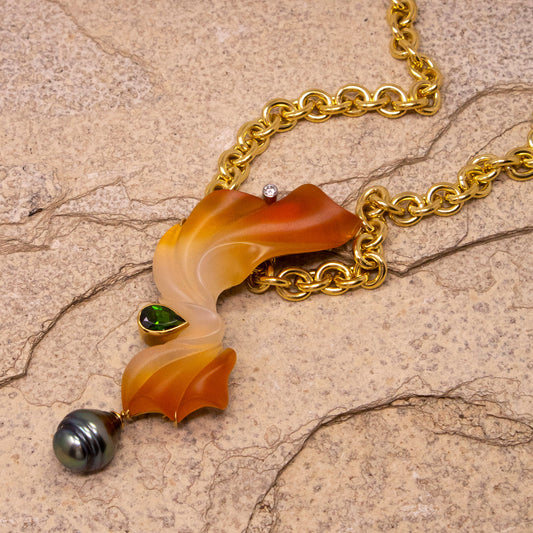 Carnelian Sculpture with Tahitian Pearl in 18kt Pendant, Enhancer, & Brooch