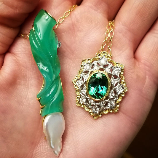 Chrysoprase Sculpture with Pearl in 18kt Pendant, Enhancer, & Brooch