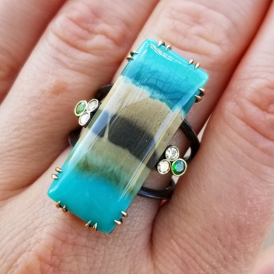Opalized Fossil Wood 18kt & Sterling Silver Shield Ring