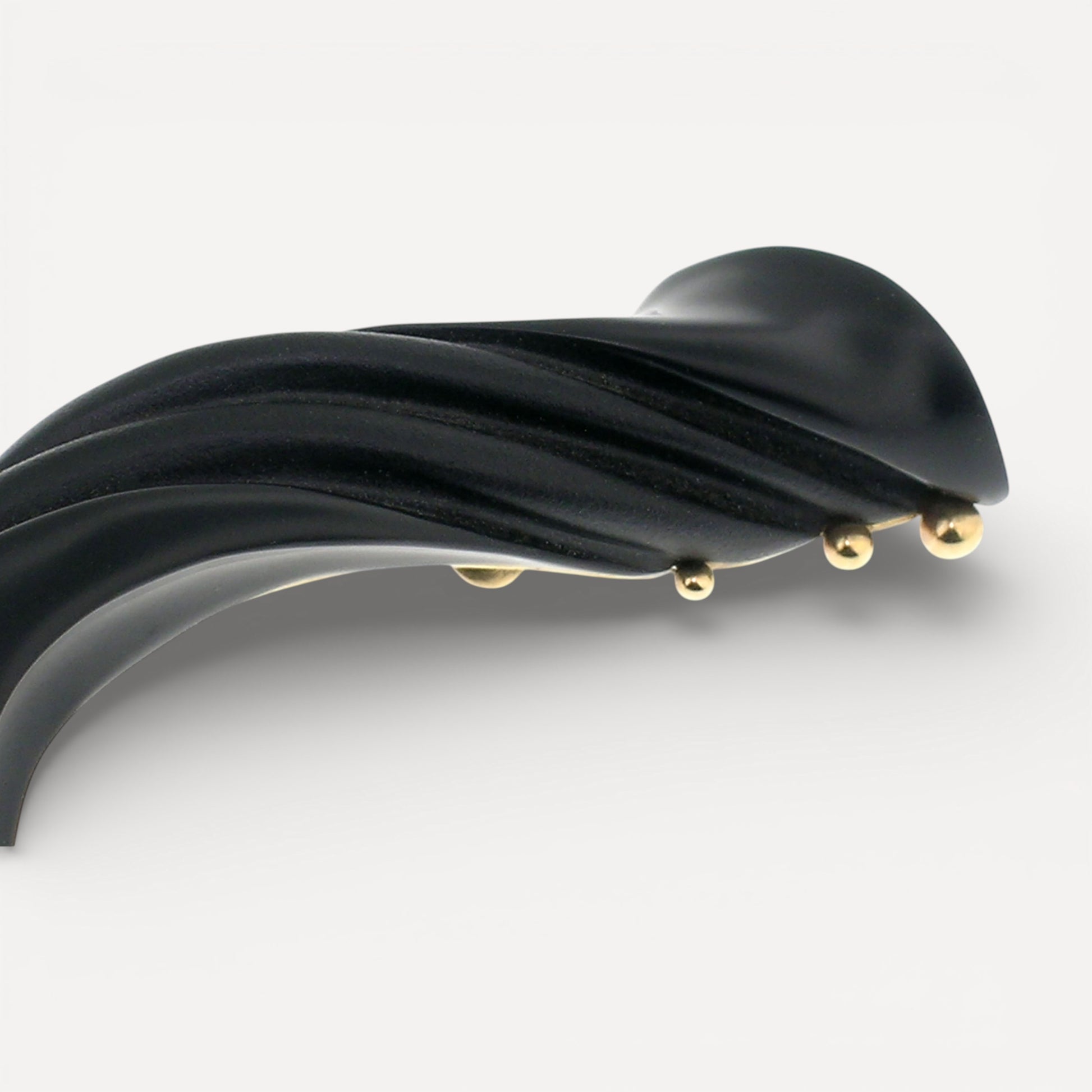 The boldly outstretched wings of this luxuriously carved black chalcedony sculpture by renowned American lapidary artist Steve Walters will be a graceful addition to any shoulder or label.